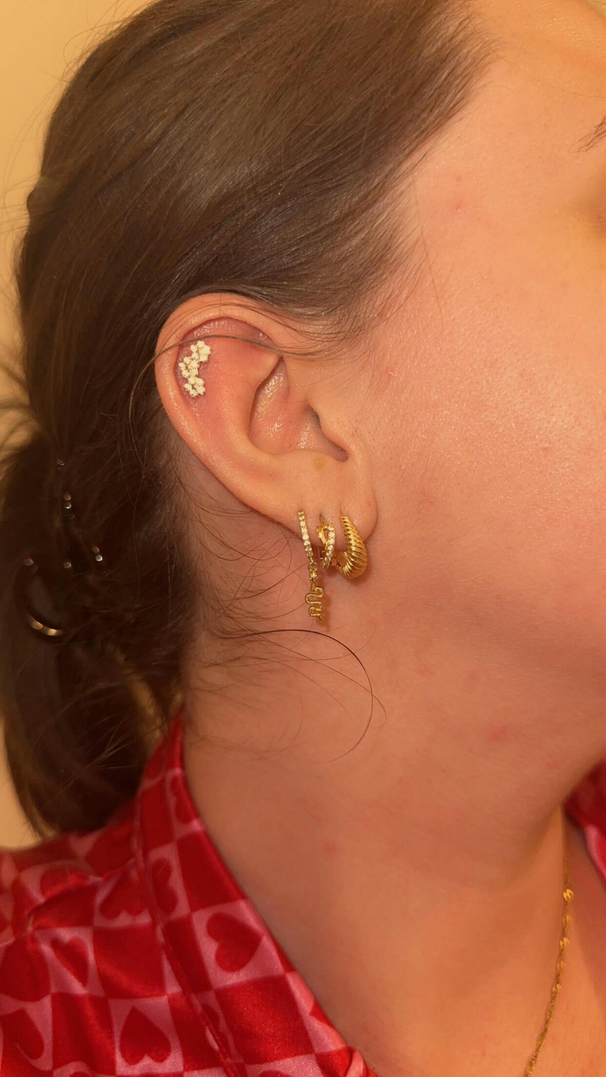 Descubre el sublime piercing Adara. Una joya con diseño floral perfecta para realzar una composición en el oído.